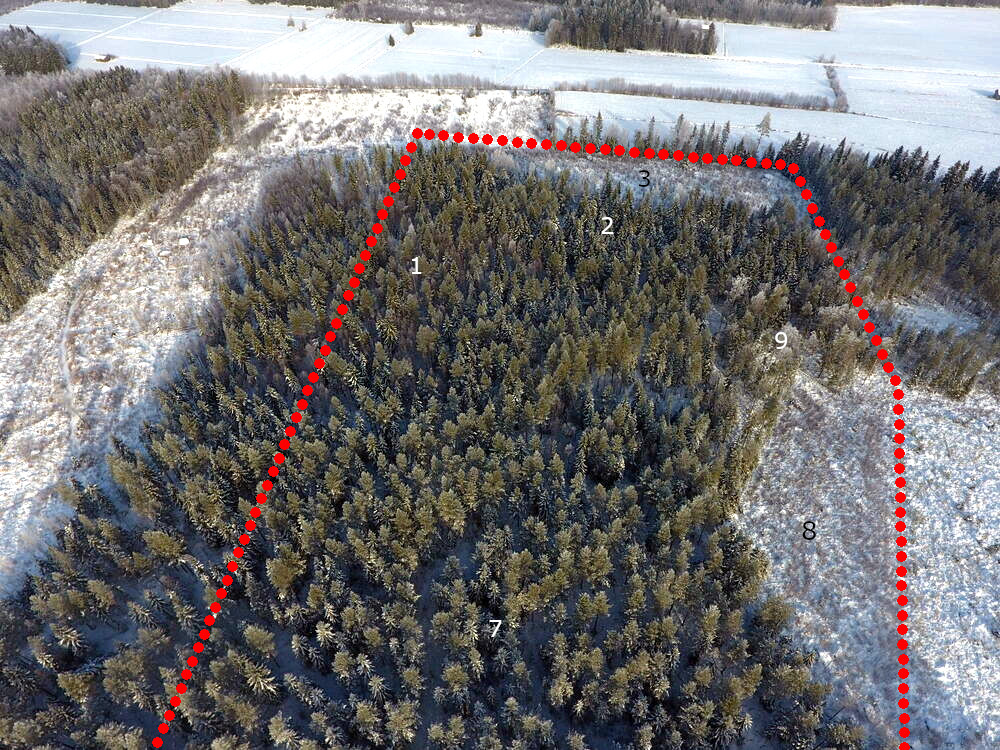 Dronekuviin pyritty piirtämään suuntaa-antavasti tilan rajoja ja kuvionumeroita. Todelliset rajat ja kuvioiden sijainnit voivat poiketa kuviin piirretyistä. Maastokuvat otettu 24.2.2026.